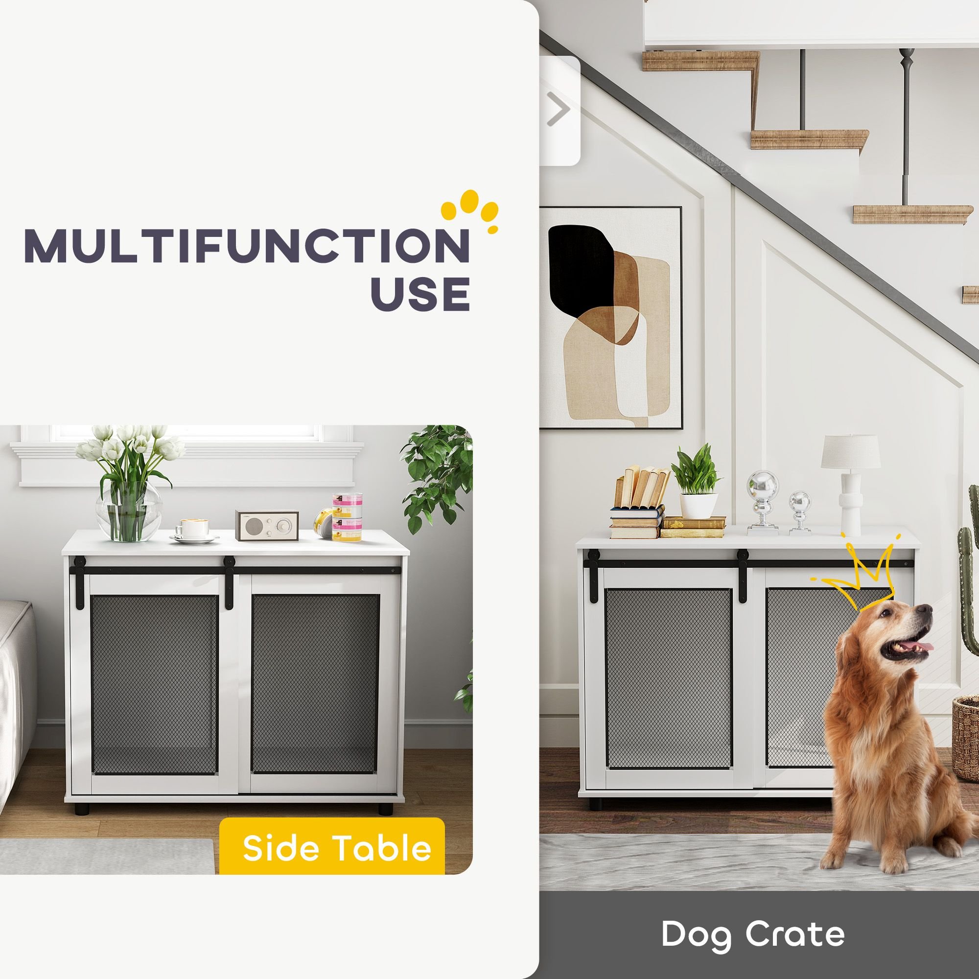 Discover the versatile PawHut large dog kennel furniture, where functionality meets style! Use it as a cosy dog crate or a chic side table; its particleboard and fine mesh grid design keep your furry friend from chewing. Boasting a dual-door setup, including a stylish barn door, this piece ensures comfort with a three-sided ventilation system and spacious interior for large dogs.