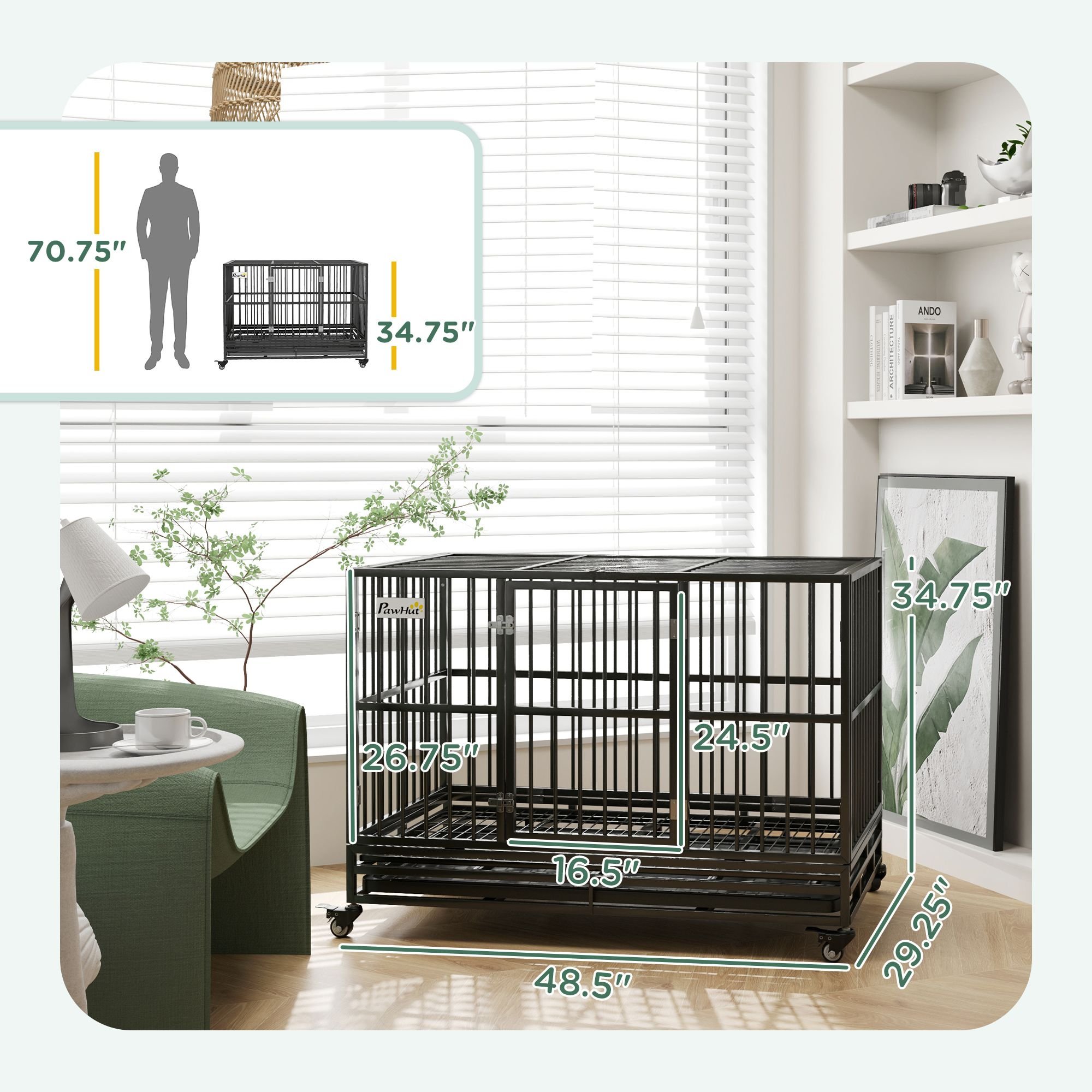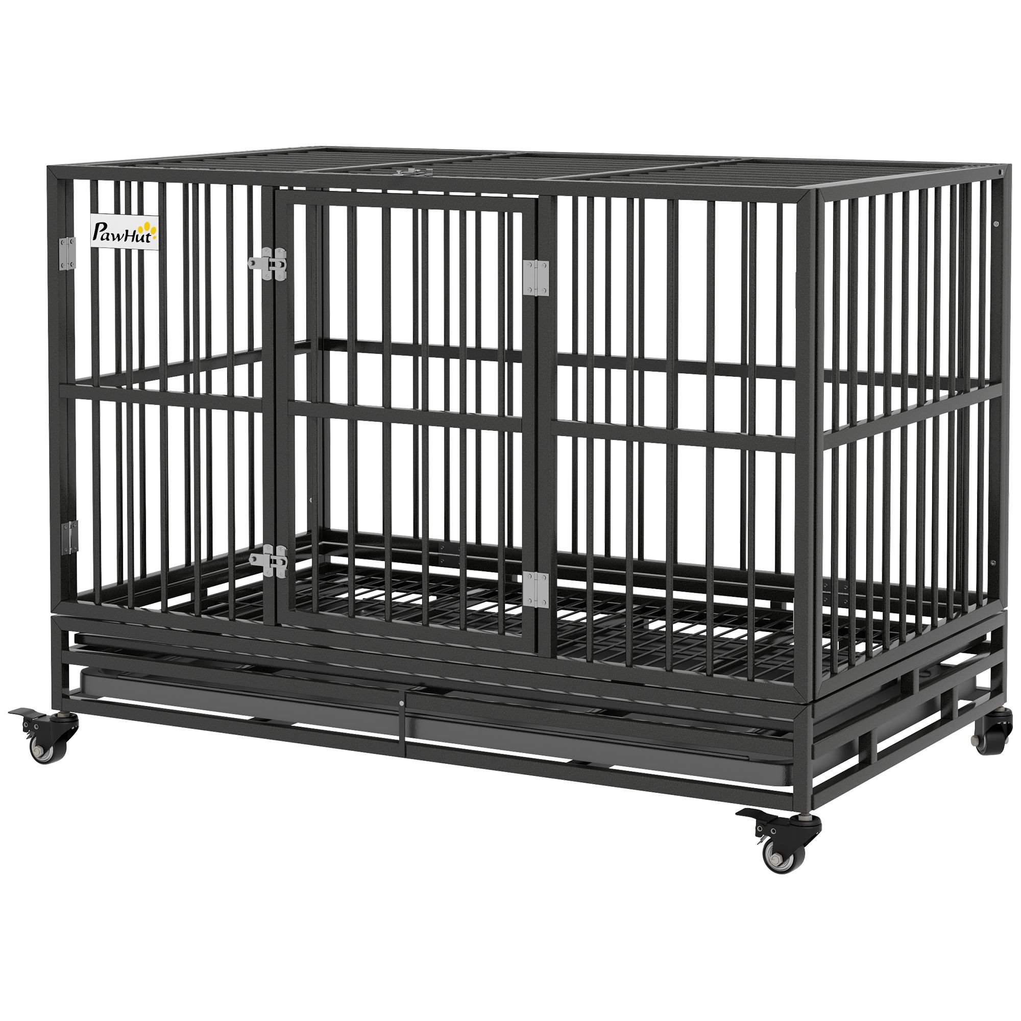 The PawHut dog kennel provides a comfortable and secure home for your furry friend. Its bar spacing allows a more breathable cage. Constructed with a sturdy steel frame and gauge tubes, each bar was welded to the frame for weight capacity and strength. A slide-out tray and grate make cleaning and maintenance easy. The top of the dog cage flips up, and together with the front door, you have two ways to pet and tend to your pup. Both latch to keep dogs safely inside while allowing you easy access.