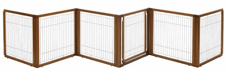 This gate can also be converted into a pet pen. This wonderful gate comes in a 6-panel design with a rich brown hardwood finish. To create a stable room divider this gate must be set up in a zigzag pattern which is secured in place with cap-locks. To create a stable Freestanding gate, the two end panels of this gate must be folded in on a 90 degree angle which is held in place with the cap-locks.